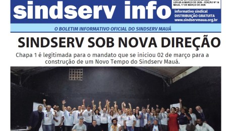 A 14ª edição do boletim informativo do Sindicato dos Servidores Públicos (Sindserv) de Mauá está disponível para leitura e compartilhamento. A distribuição ocorrerá entre 17 e 31 de março de 2026, com uma tiragem de 5.000 exemplares.