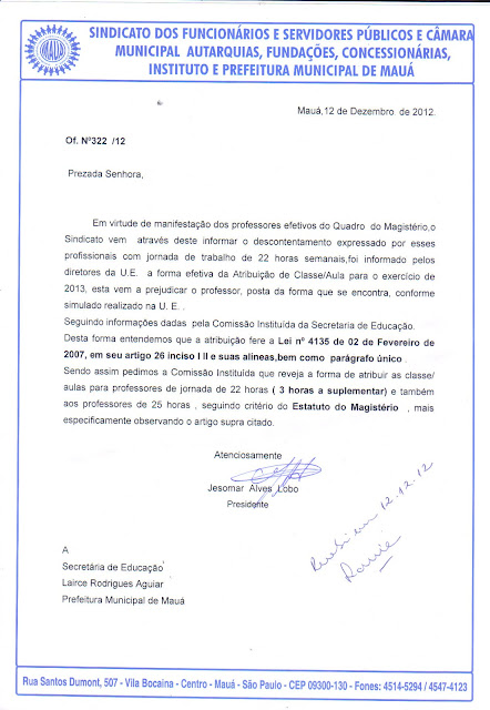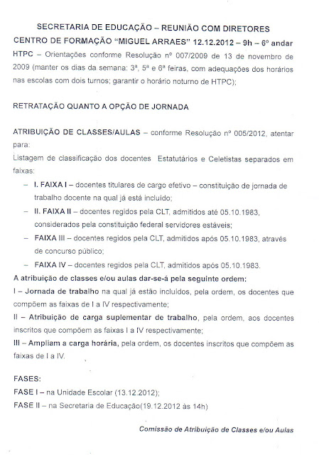 No dia 12 de Dezembro de 2012, o Sindicato protocolou ofício e esteve em reunião com a Secretária de Educação e comissão organizadora, buscando entendimentos a fim de sanar dúvidas quanto a atribuição de aulas dos Professores.