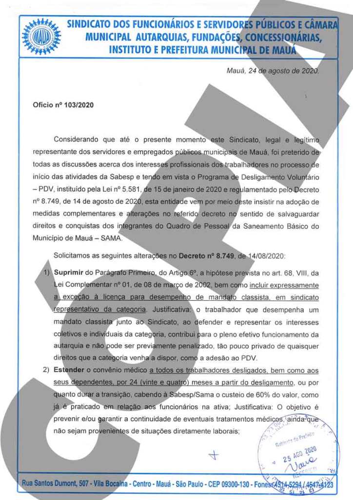 O Sindicato dos Servidores e Funcionários Públicos (Sindserv) de Mauá encaminhou ao prefeito Atila Jacomussi, na última segunda-feira (24), um documento com reivindicações para ampliar os direitos dos empregados que aderirem ao Programa da Desligamento Voluntário (PDV). A entidade pede que a autarquia mantenha o convênio médico por dois anos, que aumente o valor das indenizações, entre outros pontos.