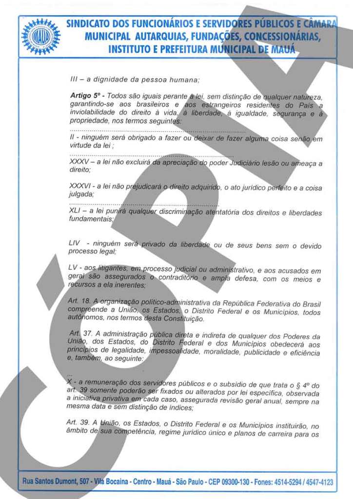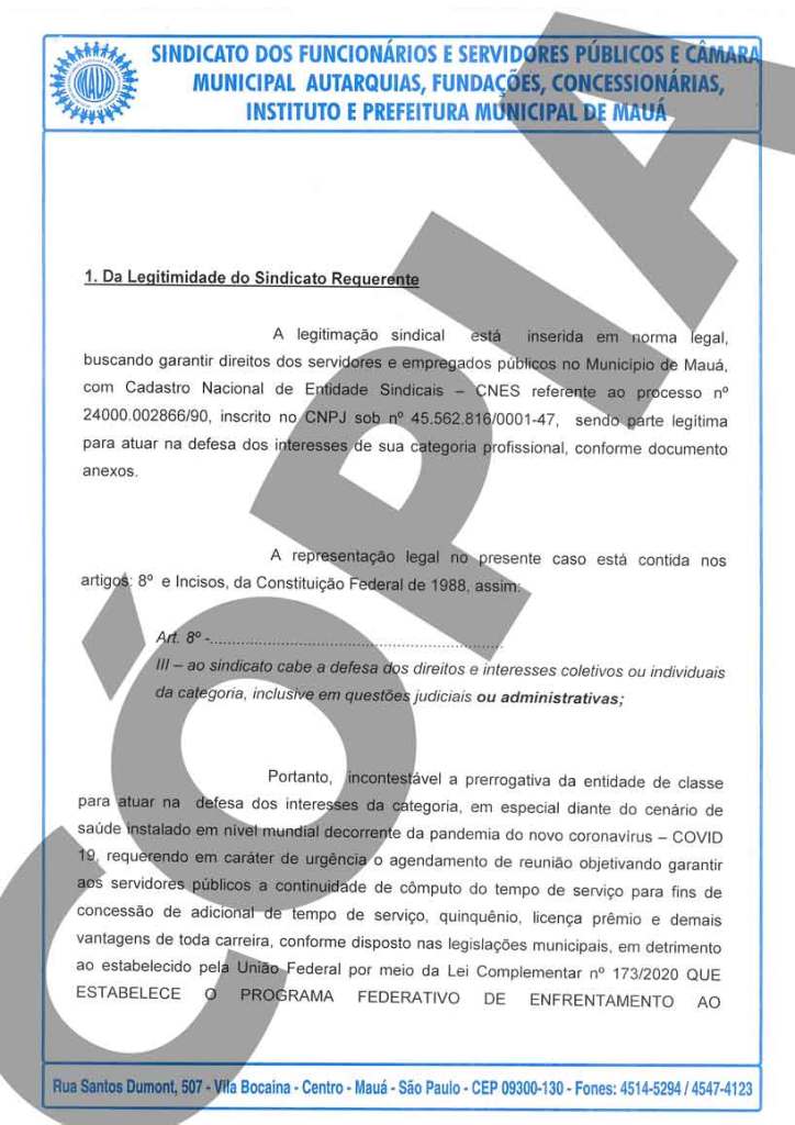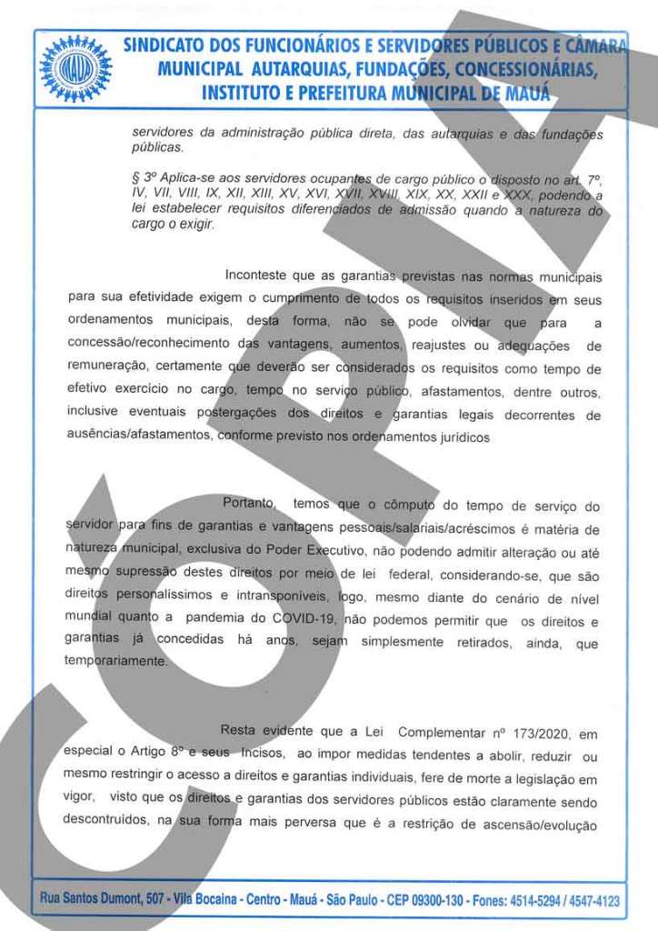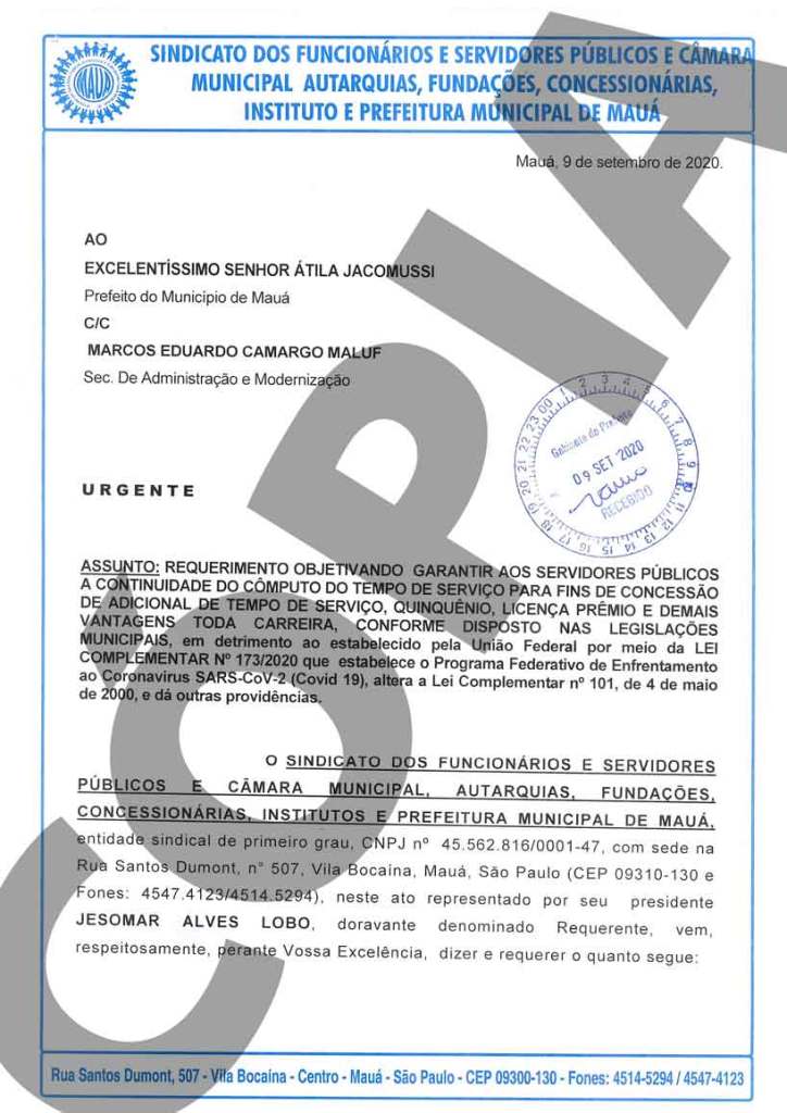 Diante do congelamento ilegal de reajustes salariais, da contagem de tempo para quinquênio e para a licença-prêmio, entre outras vantagens da carreira, o Sindicato dos Servidores e Funcionários Públicos (Sindserv) de Mauá apresentou à administração municipal, na última quarta-feira (9), em ofício encaminhado ao gabinete do prefeito, argumentos sólidos de que a interrupção de cômputo do período aquisitivo dos direitos dos trabalhadores, determinadas pela Lei Complementar nº 173/20, fere de morte a Constituição Federal, o pacto federativo e autonomia do município de legislar sobre questões municipais.