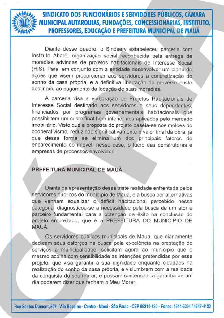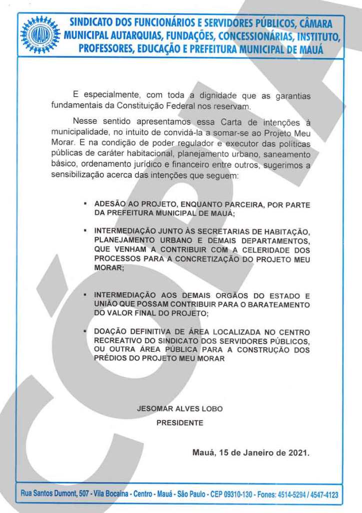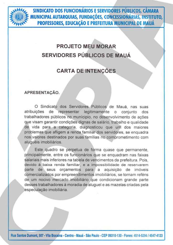 Entre os documentos apresentados, o Sindserv entregou ao secretário a carta de intenções, elaborada e aprovada em assembleia, entregue também a todos os candidatos a prefeito no período eleitoral, e o projeto técnico do empreendimento elaborado pela equipe de engenheiros e arquitetos do Instituto Abaré. A carta de intenções é um documento que apresenta as motivações e justificativas para apoiar o projeto Meu Morar e assim promover sinergia entre os diferentes atores envolvidos e dar celeridade à construção das cerca de 300 moradias destinadas a servidores públicos municipais e famílias de baixa renda.