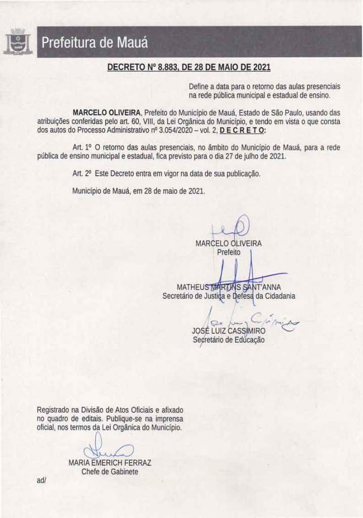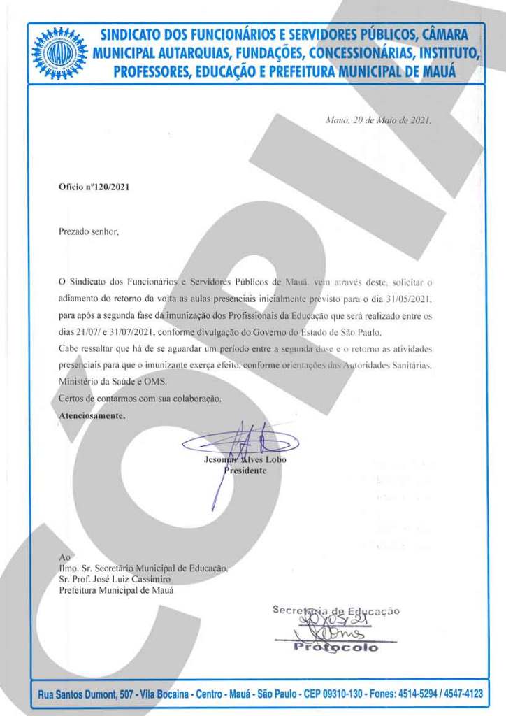Na manhã desta sexta-feira (28), a diretoria do Sindserv reuniu-se com o secretário de Educação, professor José Luiz Cassimiro para reforçar a reivindicação. À tarde, a Prefeitura de Mauá publicou no diário oficial o Decreto nº 8.883/21, que adia o retorno das aulas presenciais para 27 de julho. Inicialmente, a volta às escolas estava prevista para 31/05.