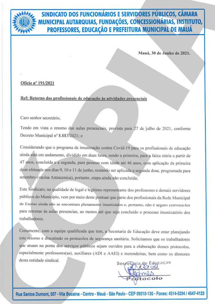 Diante do retorno das aulas presenciais, programado para o próximo dia 27, o Sindicato dos Servidores e Funcionários Públicos (Sindserv) de Mauá encaminhou um alerta à Secretaria de Educação sobre os riscos de convocar profissionais da categoria que ainda não estão imunizados contra a Covid-19. A vacinação dos educadores foi dividida em duas etapas e a última será concluída em setembro.