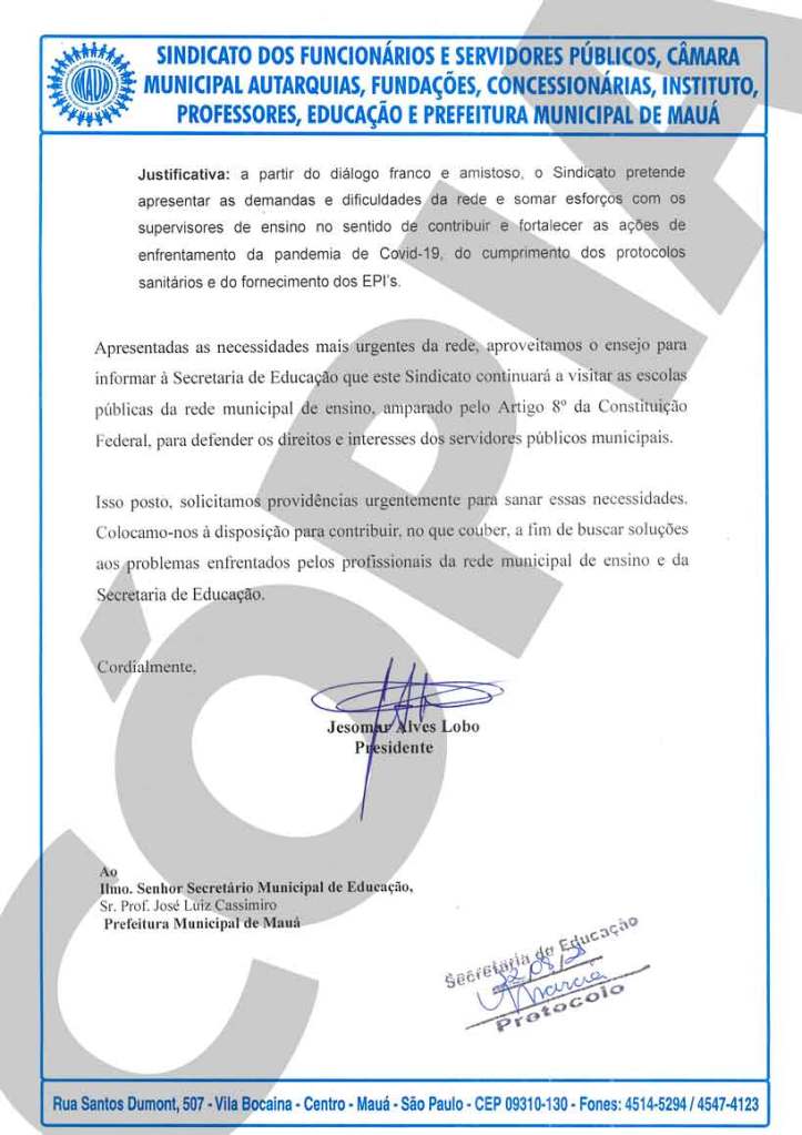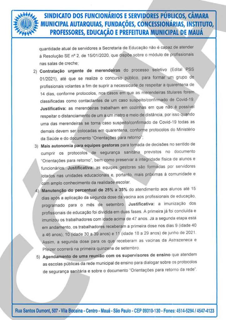 No dia 11 de agosto, o Sindicato encaminhou à Secretaria de Educação um levantamento dos principais problemas encontrados na rede municipal de ensino, levantados a partir de visitas às escolas municipais e sugeriu medidas urgentes para garantir o mínimo de segurança sanitária a alunos e servidores: contratação de mais ADI e merendeiras, mais autonomia para diretores de escola, manutenção do percentual de 25% a 35% do atendimento até a completa imunização dos educadores e o agendamento de uma reunião com a equipe de supervisores de ensino.