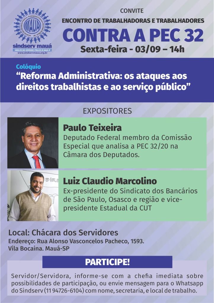Com intuito de informar dos riscos aos direitos dos trabalhadores do setor público, caso a PEC 32/20 seja aprovada, o Sindicato dos Servidores e Funcionários Públicos (Sindserv) de Mauá promove um debate com a participação de lideranças sindicais com o tema “Reforma Administrativa: os ataques aos direitos trabalhistas e ao serviço público”. O evento, que ocorrerá na próxima sexta-feira (3), a partir das 14 horas, na Chácara dos Servidores, conta com o apoio do Sindicato dos Bancários do ABC.