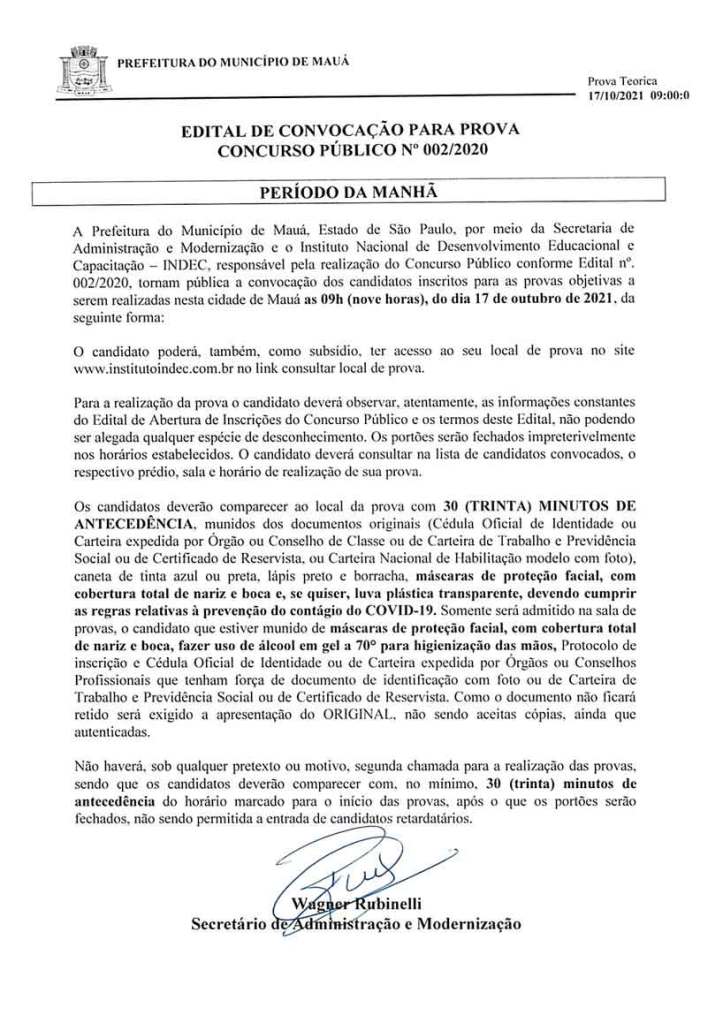 Nesta sexta-feira (10), a Prefeitura de Mauá e o Indec, organizadora do certame, publicaram a convocação para as provas, que ocorrerão no dia 17 de outubro. Ao todo são 633 vagas para os cargos de merendeira, auxiliar de apoio à educação inclusiva, auxiliar de desenvolvimento infantil, professor, diretor de escola e supervisor de ensino.