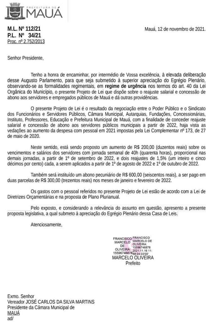 De acordo com a mensagem do prefeito Marcelo Oliveira aos vereadores, a proposta é fruto da negociação com o Sindserv. “O Projeto é o resultado da negociação entre o Poder Público e o Sindserv de Mauá, com a finalidade de conceder reajuste salarial e concessão de abono aos servidores públicos municipais a partir de 2022, haja vista as vedações ao aumento da despesa com pessoal em 2021 impostas pela Lei Complementar nº 173/20”, pontuou.