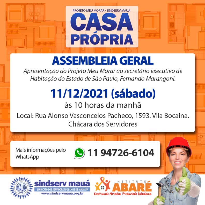 Os participantes do projeto Meu Morar estão convidados para participar da última assembleia geral do ano, neste sábado (11), na Chácara dos Servidores, a fim de apresentar os avanços do empreendimento ao secretário executivo da Secretaria de Estado da Habitação de São Paulo, Fernando Marangoni. A atividade será acompanhada por diretores do Sindicato dos Servidores e Funcionários Públicos de Mauá e técnicos do Instituto Abaré.