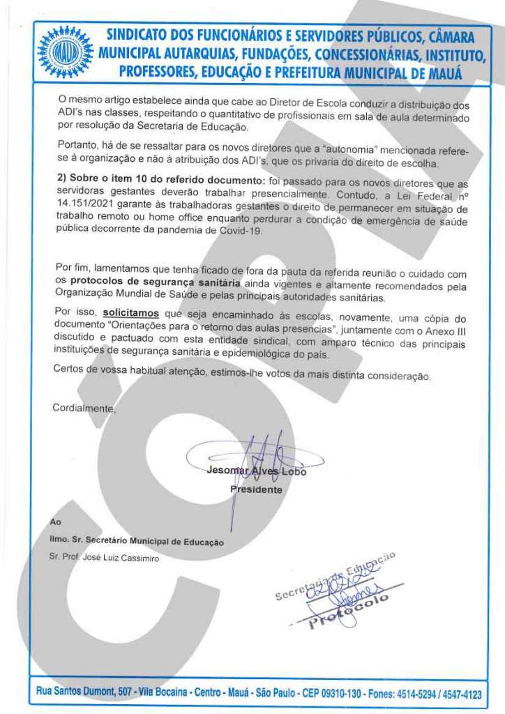 No mesmo ofício, o Sindicato pontua a importância de fazer a distribuição dos Auxiliares de Desenvolvimento Infantil com base em critérios estabelecidos em decreto e da importância de manter as escolas da rede informadas quanto aos protocolos de segurança sanitária.
