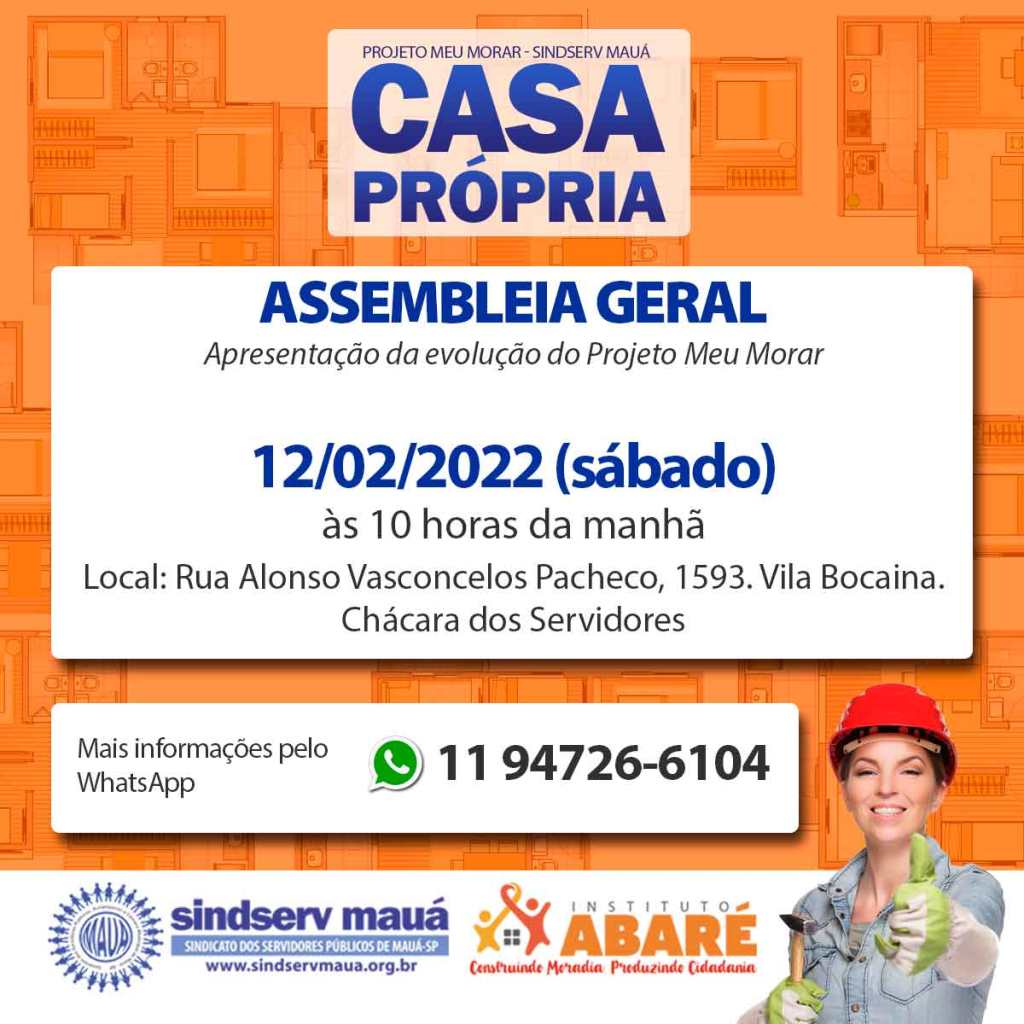 Os integrantes do projeto Meu Morar estão convocados para uma assembleia geral, que se realizará no próximo sábado (12/02/2022), a partir das 10 horas, na Chácara dos Servidores, localizado na Rua Alonso Vasconcelos Pacheco, 1593, Vila Bocaina, Mauá-SP. Pauta: avanços e informes do projeto.