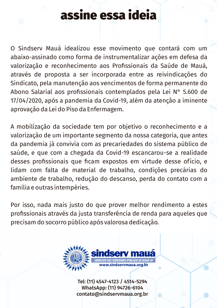 O Sindicato protocolizou um ofício para pedir atenção ao diálogo em relação ao abono, instituído pela Lei Municipal 5.600/2020, a fim de garantir a valorização dos servidores da Saúde e cemitérios, e também para explicar que os recursos utilizados já estão comprometidos com tal objetivo há pelo menos dois anos, portanto não representará majoração de despesas, mas para os trabalhadores a suspensão de tal provento representaria uma queda drástica no poder de sustendo das famílias.