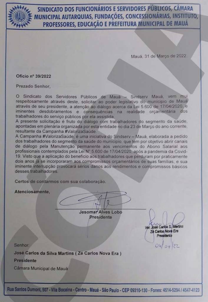 Após dar início à campanha #ValorizaSaude, o Sindicato dos Servidores e Funcionários Públicos (Sindserv) de Mauá reuniu-se com o presidente da Câmara Municipal, vereador José Carlos da Silva Marins, o Zé Carlos Nova, para informar das estratégias da iniciativa, como o abaixo assinado, e pedir apoio político dos vereadores. No mesmo dia do encontro, realizado na última segunda-feira (4), a entidade também protocolizou ofício no gabinete do prefeito.