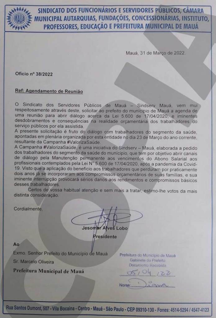 No mesmo dia, o Sindicato protocolizou outro ofício junto ao gabinete do prefeito Marcelo Oliveira para solicitar a abertura do diálogo a fim de negociar a manutenção dos proventos.