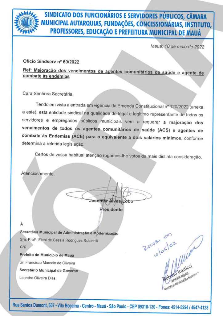 Após a promulgação pelo Congresso Nacional da PEC que estabelece o piso nacional dos agentes comunitários de saúde e agentes de combate às endemias, o Sindicato dos Servidores e Funcionários Públicos (Sindserv) de Mauá protocolizou um ofício, nesta terça-feira (10), para requerer a correção dos vencimentos do segmento. O novo piso será de dois salários mínimos e os valores serão repassados pela União.