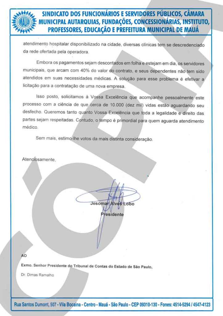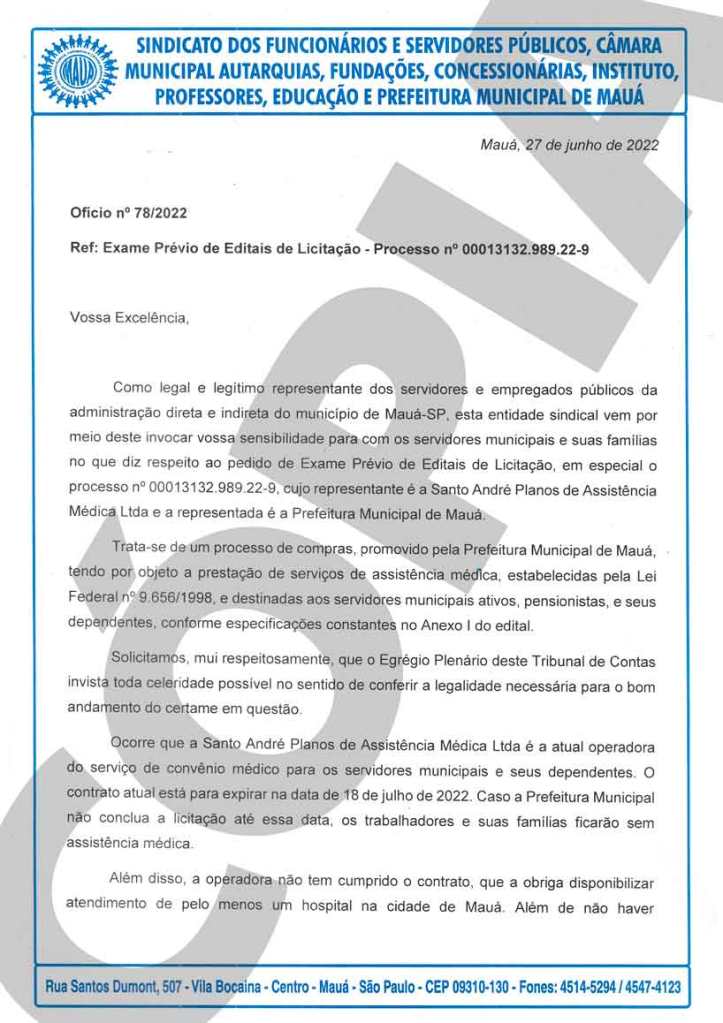 O Sindserv pontuou ao TCE-SP que o atual contrato do convênio médico dos servidores se encerrará no próximo dia 18 de julho. Caso a Prefeitura de Mauá não conclua a licitação a tempo, os cerca de 10 mil usuários, entre funcionários e seus dependentes, poderão ficar sem assistência médica.