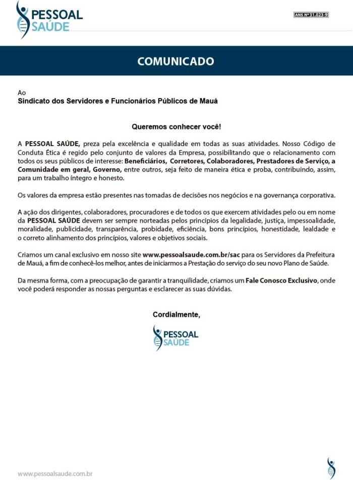 A Pessoal Saúde foi a empresa vencedora da licitação e ganhou o direito de assinar o contrato com a Prefeitura de Mauá para oferecer assistência médica aos servidores municipais e seus dependentes. Entre as novidades nos serviços que serão oferecidos estão a carteirinha digital pelo aplicativo de celular, a possibilidade de incluir netos e avós como agregados e a dispensa de guia para obter autorização de exames, consultas e procedimentos médicos.