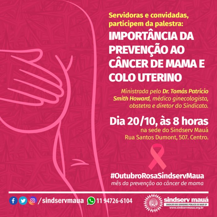 No próximo dia 20/10, à partir das 8h, em sua sede, o Sindserv realiza a palestra “Importância da prevenção ao Câncer de Mama”, ministrada pelo médico ginecologista Dr. Tomas Patrício Smith Howard.