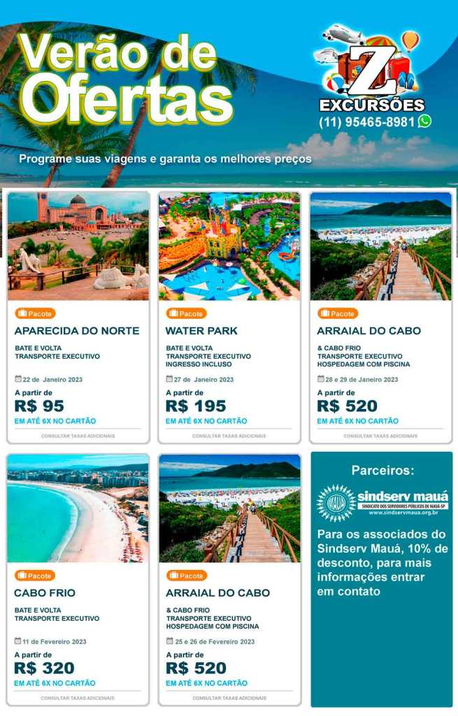 O Sindicato dos Servidores e Funcionários Públicos (Sindserv) de Mauá firmou parceria com a Z Excursões para oferecer passeios turísticos e de lazer por preços acessíveis e com desconto especial para sindicalizados. Veja: