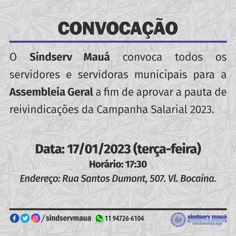 O Sindserv Mauá convoca todos os servidores e servidoras municipais para a Assembleia Geral a fim de aprovar a pauta de reivindicações da Campanha Salarial 2023.