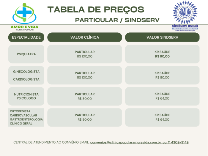 O Sindicato dos Servidores e Funcionários Públicos (Sindserv) firmou parceria com a clínica popular Amor e Vida para oferecer serviços especializados em saúde. Os sindicalizados poderão usufruir de descontos especiais.