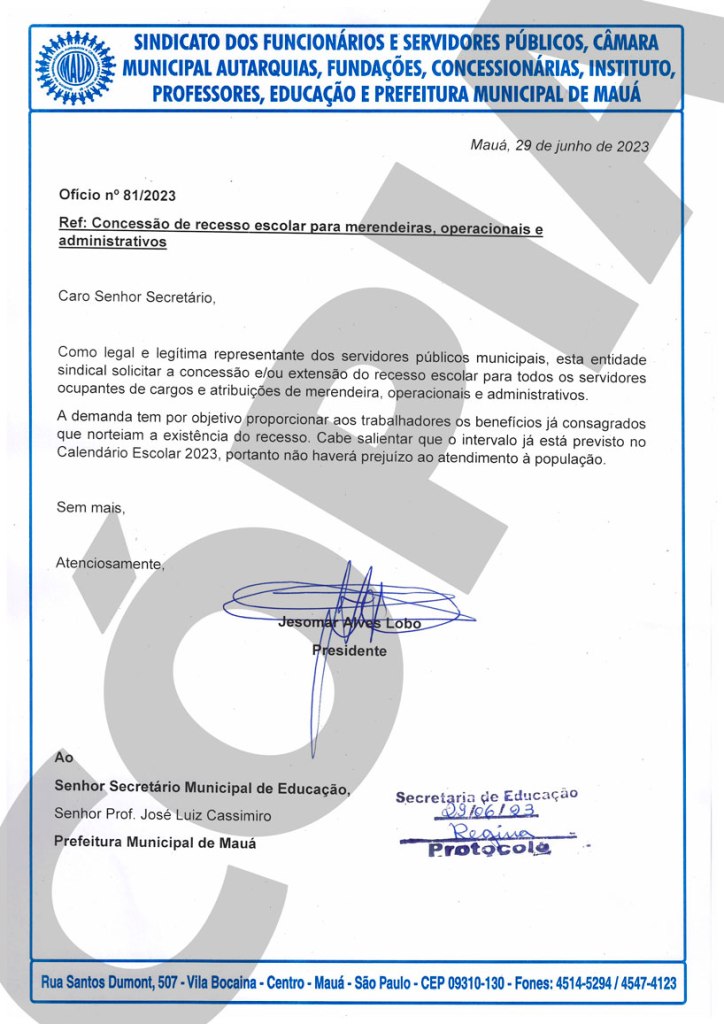 O Sindicato dos Servidores e Funcionários Públicos (Sindserv) de Mauá protocolizou um ofício junto à Secretaria Municipal de Educação para solicitar a concessão do recesso escolar a todos os trabalhadores da rede municipal de ensino, que inicia no próximo dia 6. No documento, encaminhado nesta quinta-feira (29), a entidade pede em favor de merendeiras, operacionais e administrativos.