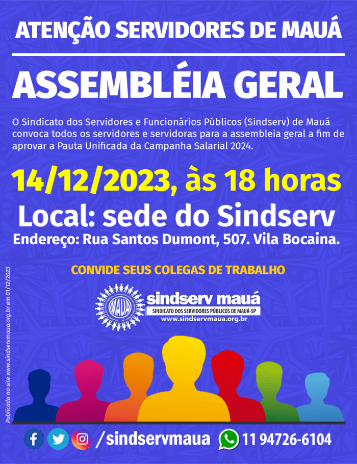 A convocação para a Assembleia Geral também está mantida. Ocorrerá dia 14/12, às 18h, na sede social do Sindserv.