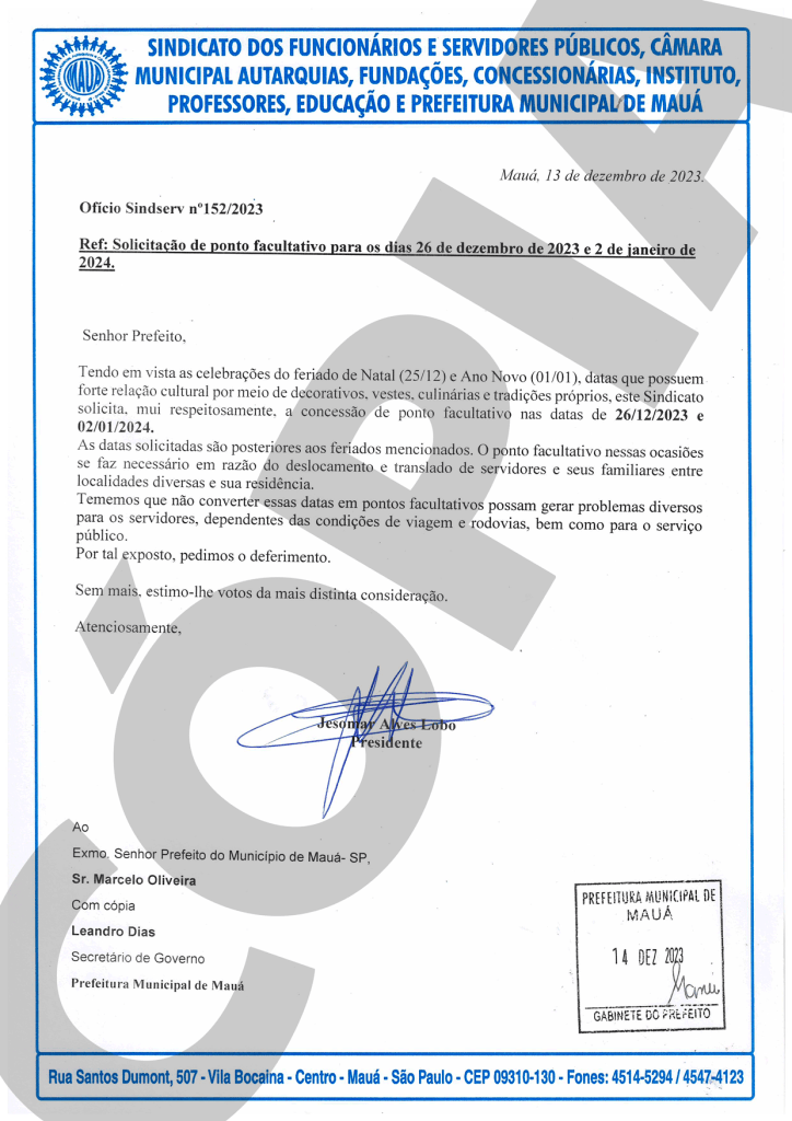 O Sindicato dos Servidores e Funcionários Públicos (Sindserv) de Mauá encaminhou ao prefeito Marcelo Oliveira uma solicitação, nesta quinta-feira (14), para que converta os dias 26/12 e 02/01 em ponto facultativo. A entidade entende que essas datas, imediatamente após Natal e Ano Novo, pode garantir mais segurança aos trabalhadores no retorno das festas.