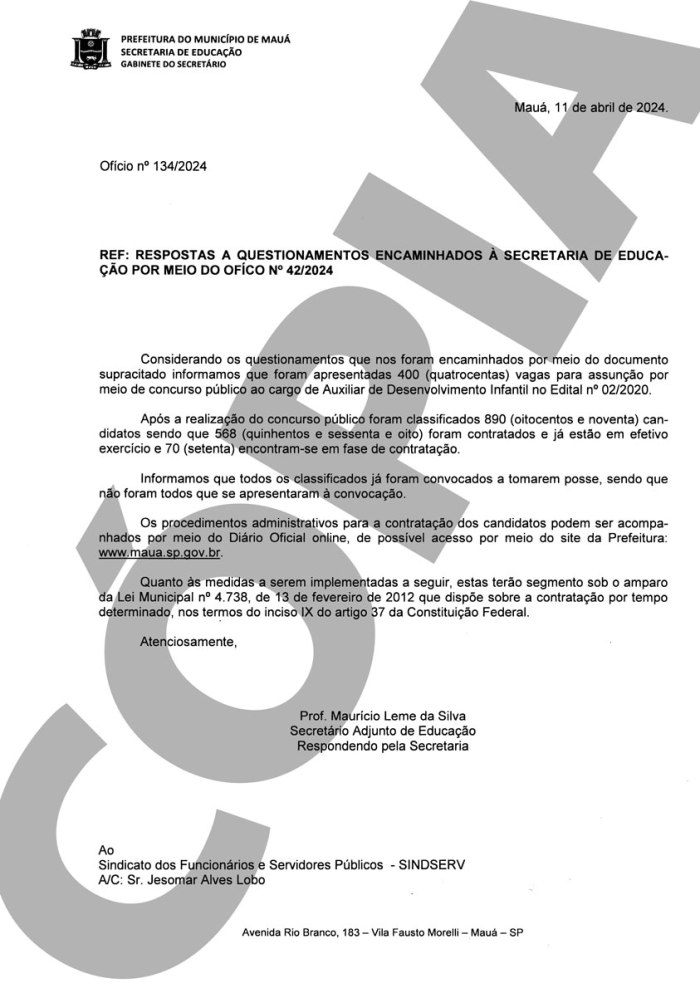 Por ofício, a Secretaria de Educação informou de forma vaga que 70 dos 140 convocados compareceram à atribuição e encontram-se em fase de admissão, e que outras medidas serão amparadas pela Lei Municipal 4.738/2012.