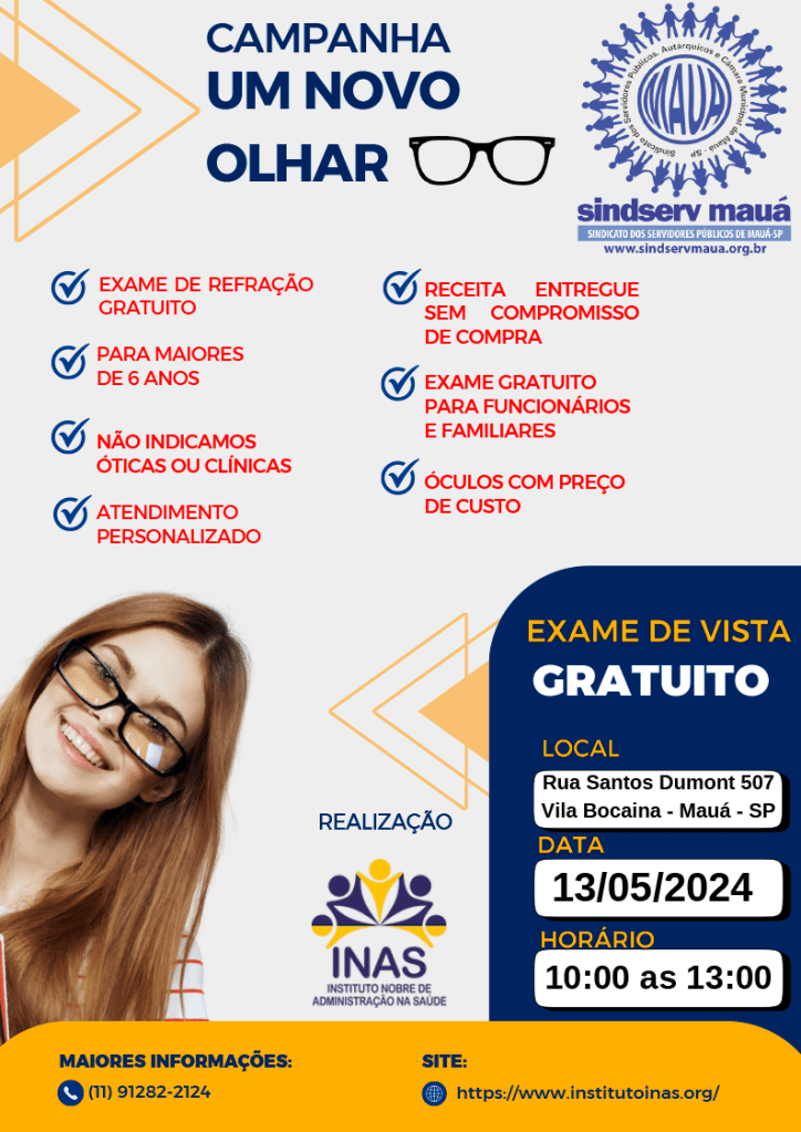 Em parceria com o Instituto Nobre de Administração na Saúde (Inas), o Sindicato dos Servidores e Funcionários Públicos (Sindserv) receberá a campanha Um Novo Olhar, na próxima segunda-feira (13/05), das 10h às 13h, na sede da entidade, que vai oferecer serviços oftalmológicos e exame de vista gratuito. O evento será aberto à toda a comunidade.
