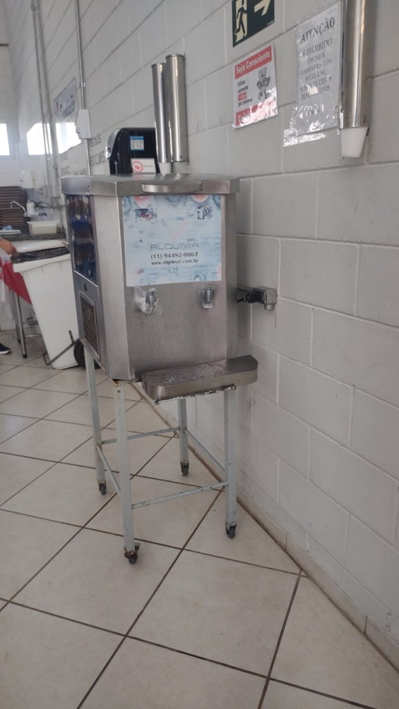 A empresa prestadora do serviço atendeu o pedido e a máquina de suco foi reposicionada para o lado interno do restaurante.
