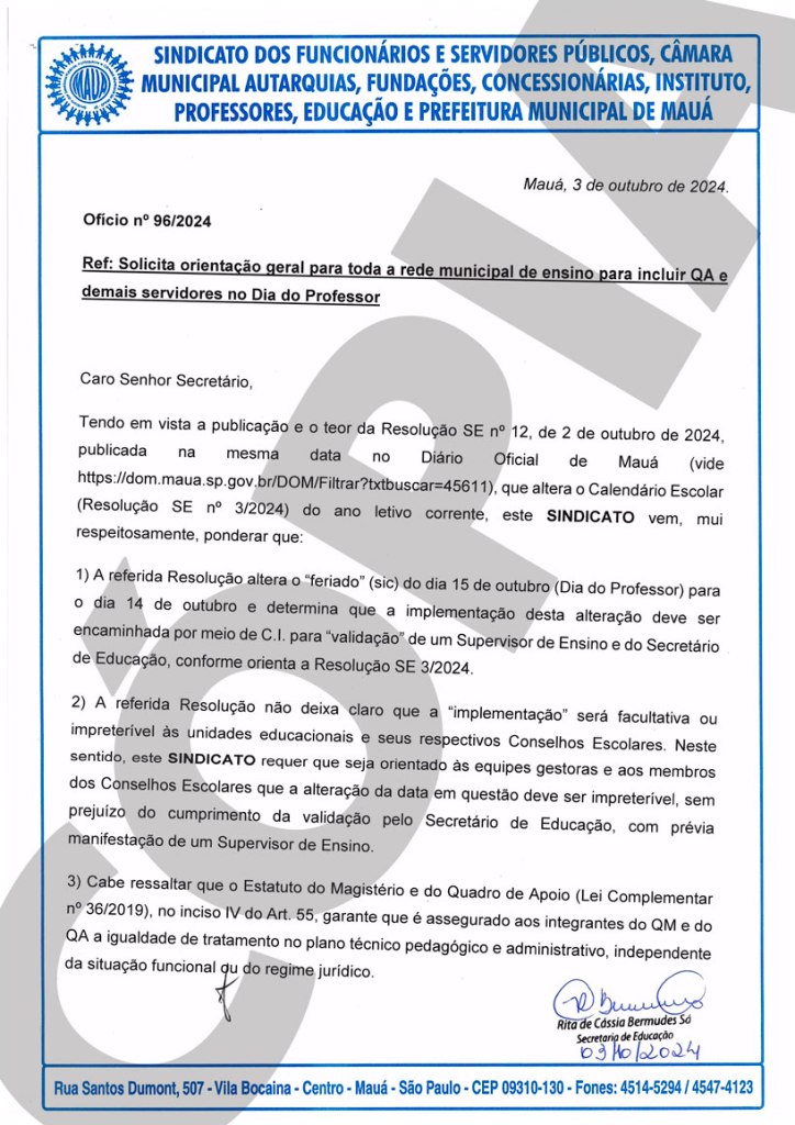 Integrantes da diretoria do Sindicato dos Servidores e Funcionários Públicos (Sindserv) de Mauá reuniram-se com o secretário de Educação, Maurício Leme da Silva, nesta quinta-feira (3), para reivindicar a concessão do ponto facultativo em comemoração ao Dia dos Professores, no dia 14/10, a todos os servidores da rede municipal de ensino. A medida foi aprovada e todos os trabalhadores serão contemplados.