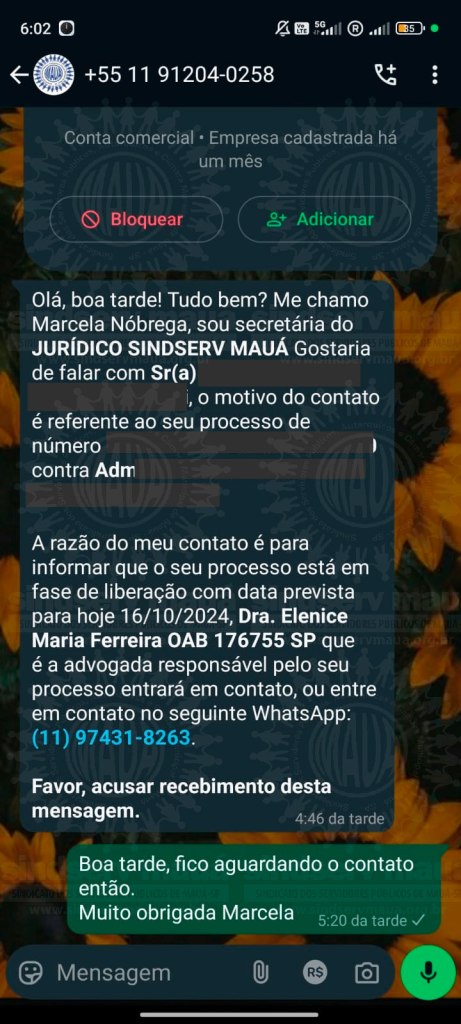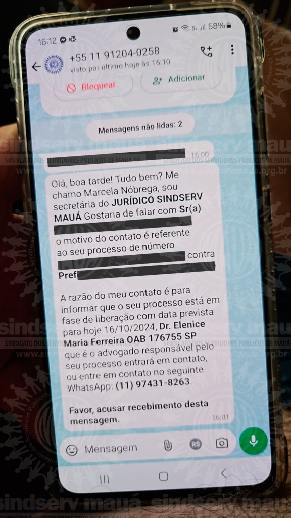 Na data de ontem (16/10/24), fomos informados de que um golpista, que se apresenta como “Marcela Nóbrega, secretária do Jurídico Sindserv Mauá” e utiliza o telefone 11 91204-0258, entrou em contato por meio do aplicativo WhatsApp com servidores e servidoras sindicalizados representados pela Drª Elenice Maria Ferreira, advogada do Sindicato.