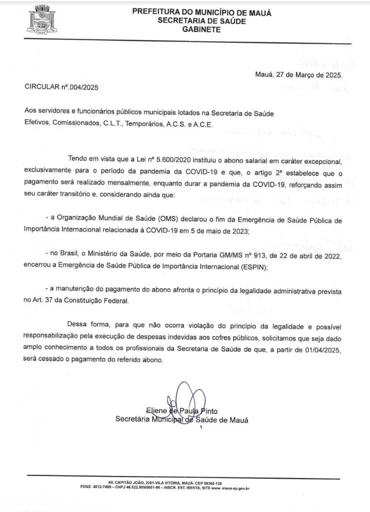 Em um movimento que o Sindicato dos Servidores e Funcionários Públicos (Sindserv) classifica como unilateral e desrespeitoso, a Secretaria de Saúde de Mauá anunciou o encerramento do abono salarial concedido aos profissionais da saúde que estiveram na linha de frente do combate à pandemia de Covid-19. A decisão, comunicada por meio de uma circular que sequer foi publicada no Diário Oficial, gerou indignação e revolta entre a categoria, que se viu surpreendida com o anúncio feito com apenas cinco dias de antecedência.