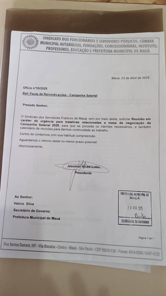 Os trabalhadores e trabalhadoras da Prefeitura de Mauá estão indignados com a postura de descaso e procrastinação da atual gestão municipal diante da pauta de reivindicações apresentada pelo Sindicato dos Servidores e Funcionários Públicos (Sindserv). Nesta quinta-feira (24/04), a entidade protocolou formalmente um requerimento exigindo a abertura imediata das negociações da Campanha Salarial 2025.