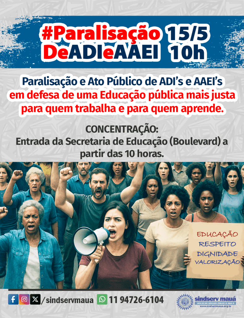 O Sindserv reafirma seu compromisso com a defesa de condições dignas de trabalho, valorização salarial e respeito à categoria. A mobilização desta quinta-feira é um passo importante na construção de uma Educação pública mais justa para quem trabalha e para quem aprende. O Sindicato exige que a Prefeitura de Mauá abra imediatamente canal de diálogo efetivo com a categoria e apresente soluções concretas para os problemas enfrentados pelos ADIs e AAEIs.