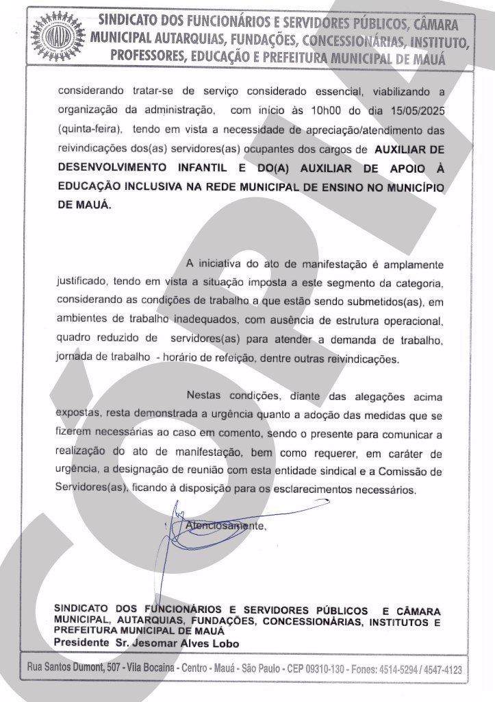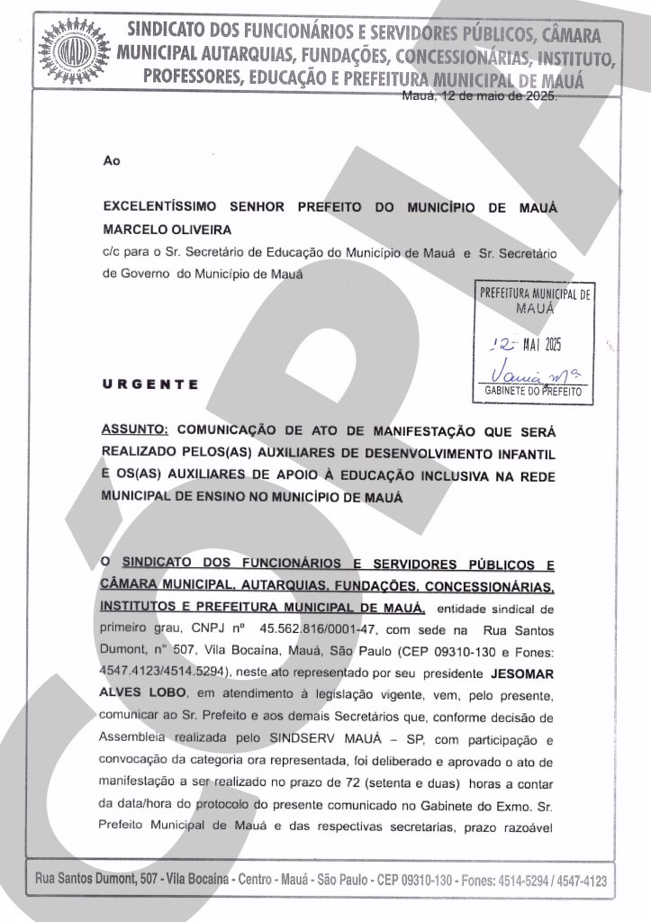 O Sindicato dos Servidores e Funcionários Públicos de Mauá (Sindserv) notificou formalmente a Prefeitura Municipal, nesta segunda-feira (12/5), sobre a paralisação e o ato público que serão realizados na próxima quinta-feira (15/5) pelos Auxiliares de Desenvolvimento Infantil (ADIs) e Auxiliares de Apoio à Educação Inclusiva (AAEIs). A mobilização é uma resposta direta às condições precárias de trabalho e à desvalorização profissional enfrentadas pela categoria.