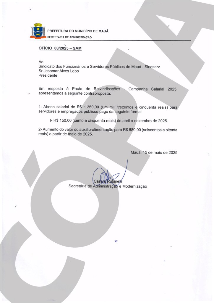 Em assembleia geral realizada nesta terça-feira (20/5), convocada pelo Sindicato dos Servidores Públicos (Sindserv) de Mauá, as servidoras e os servidores municipais rejeitaram, de forma categórica, a contraproposta apresentada pela gestão. O governo municipal ofereceu um abono temporário de R$ 150 em nove parcelas e um reajuste irrisório de R$ 20 no auxílio alimentação — proposta considerada pela categoria como inviável diante da defasagem salarial e da crescente precarização das condições de trabalho no serviço público.