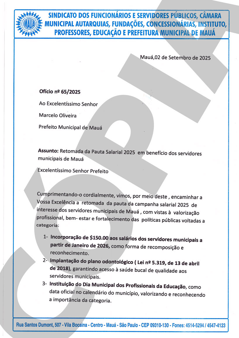 Já existe Lei e Decreto municipais que instituem o convênio odontológico para todos os servidores da Prefeitura. O Sindicato reivindica que o benefício seja efetivado até o fim de 2025 ou início de 2026.