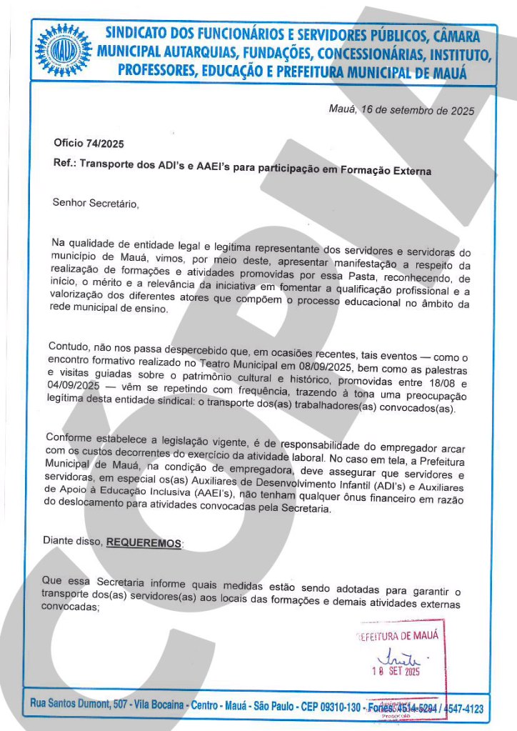 “Conforme estabelece a legislação vigente, é de responsabilidade do empregador arcar com os custos decorrentes do exercício da atividade laboral. A Prefeitura de Mauá, na condição de empregadora, deve assegurar que servidores e servidoras não tenham ônus financeiro em razão do deslocamento para atividades convocadas pela Secretaria de Educação”, destacou.