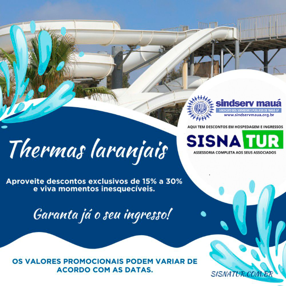 Graças à parceria entre o Sindserv Mauá e a Sisnatur, você e sua família podem viver momentos inesquecíveis no Thermas dos Laranjais, um dos maiores parques aquáticos da América Latina, com descontos exclusivos de 15% a 30% em ingressos e hospedagem! 🏖️🎢