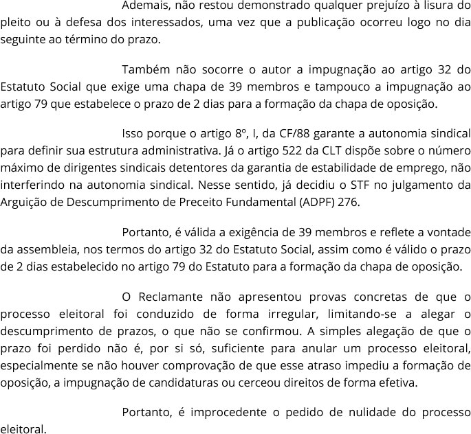Com a improcedência do pedido, a comissão eleitoral responsável pela condução do processo — composta por representantes de entidades como o Sindserv de São Bernardo do Campo, a OAB Mauá e o Conselho Municipal de Educação — dará prosseguimento aos trâmites estatutários e definirá a nova data para a realização da Assembleia de Aclamação, conforme o Estatuto Social do Sindserv Mauá.