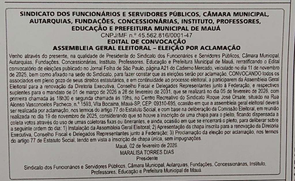 Edital de Convocação – Assembleia Geral Eleitoral mauasindserv / 02/02/2026 Edital publicado no jornal Folha de São Paulo, em 02/02/2026. Compartilhe isso: Compartilhar no X(abre em nova janela) 18+ Compartilhar no Facebook(abre em nova janela) Facebook Compartilhar no LinkedIn(abre em nova janela) LinkedIn Compartilhar no WhatsApp(abre em nova janela) WhatsApp Curtir Carregando...