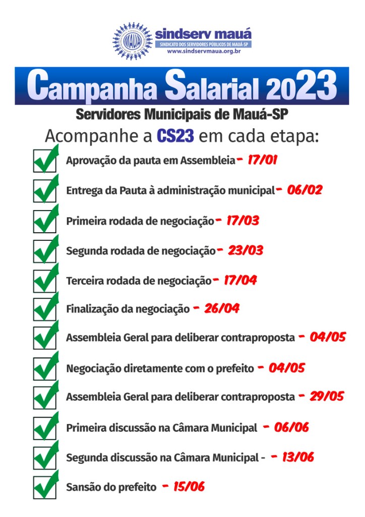Os servidores e servidoras públicos de Mauá aprovaram a pauta de reivindicações para a Campanha Salarial 2023 no dia 17 de janeiro de 2023, em Assembleia Geral realizada na sede do Sindicato.