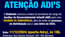 Todos os servidores municipais do cargo de Auxiliar de Desenvolvimento Infantil (ADI) estão convocados para uma reunião de emergência a fim de tratar do processo de distribuição para o ano letivo de 2025, na próxima quarta-feira (11/12/2024), a partir das 18h, na sede do Sindicato dos Servidores e Funcionários Públicos (Sindserv) de Mauá. A sede…